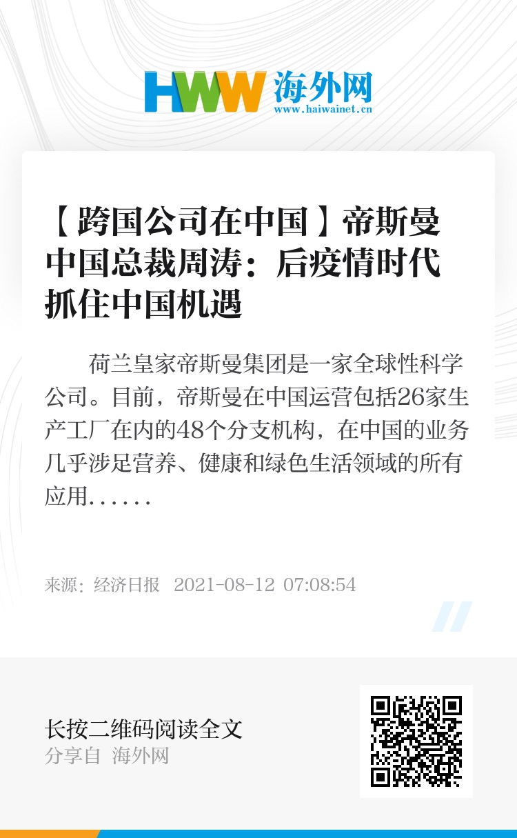 近年来,帝斯曼持续加大对中国业务的投入。帝斯曼中国总裁周涛在接受经济日报记者采访时表示,帝斯曼看好后疫情时代的中国市场,在过去疫情肆虐的一年多来,帝斯曼在中国的销售额仍在增加,占全球销售额的比重也上涨至14.6%。