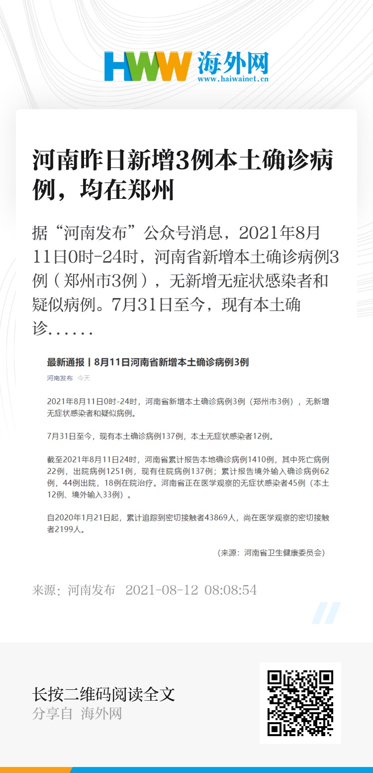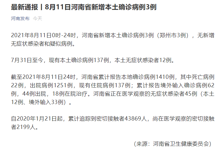 据“河南发布”公众号消息,2021年8月11日0时-24时,河南省新增本土确诊病例3例(郑州市3例),无新增无症状感染者和疑似病例。