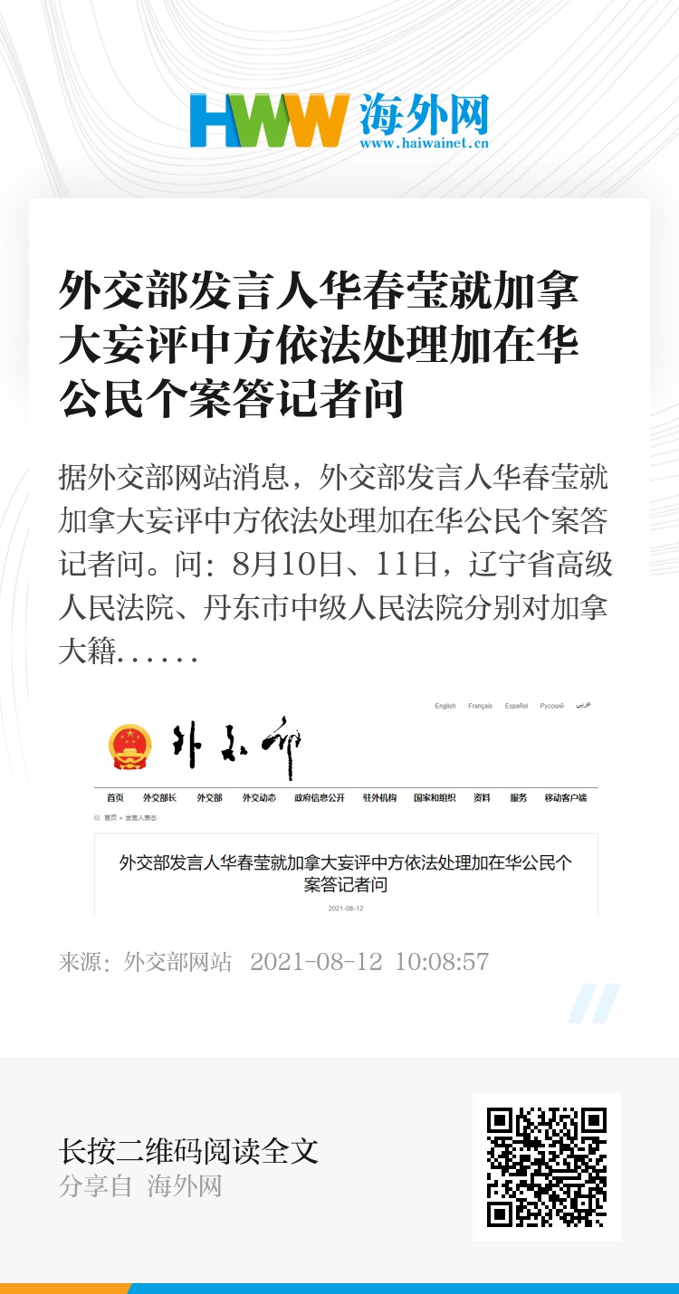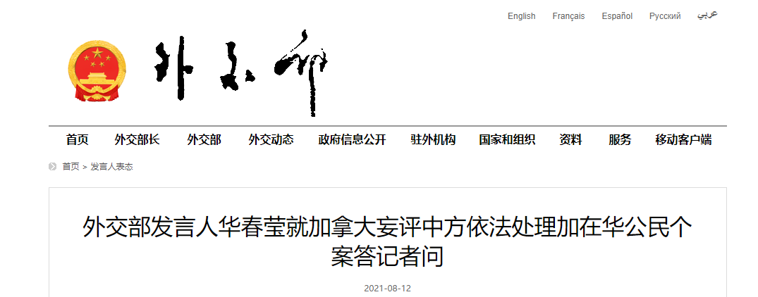据外交部网站消息,外交部发言人华春莹就加拿大妄评中方依法处理加在华公民个案答记者问。
