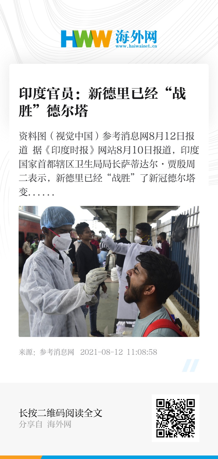 参考消息网8月12日报道 据《印度时报》网站8月10日报道,印度国家首都辖区卫生局局长萨蒂达尔·贾殷周二表示,新德里已经“战胜”了新冠德尔塔变异株。在该市第二波疫情期间以及之后,该变异株在送去进行基因组测序的新冠病毒样本中占八成以上。