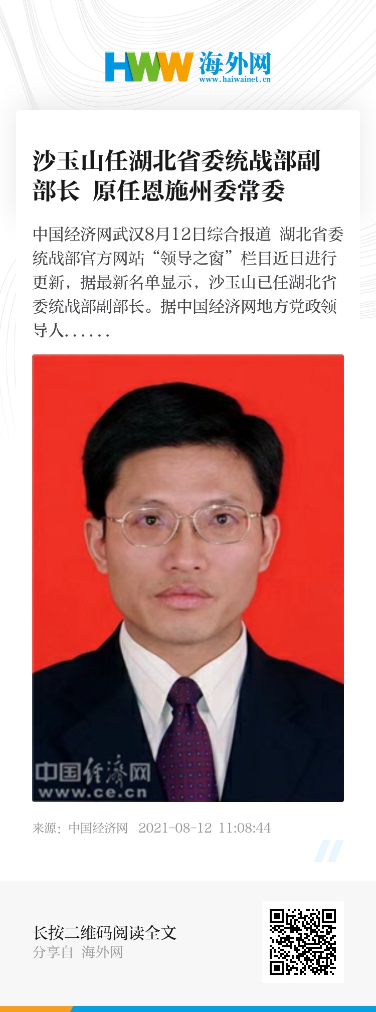 中国经济网武汉8月12日综合报道 湖北省委统战部官方网站“领导之窗”栏目近日进行更新,据最新名单显示,沙玉山已任湖北省委统战部副部长。
