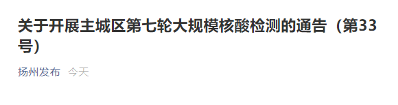 据“扬州发布”公众号消息,扬州市新冠肺炎疫情防控工作指挥部12日发布《关于开展主城区第七轮大规模核酸检测的通告(第33号)》,全文如下: