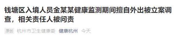 钱塘区白杨街道观澜社区对金某某落实管理要求不到位,造成管理对象擅自外出,产生涉疫风险。钱塘区有关部门对该社区主要负责人漏某某给予党内警告处分,金某某健康监测联络人诸某某给予党内严重警告处分。