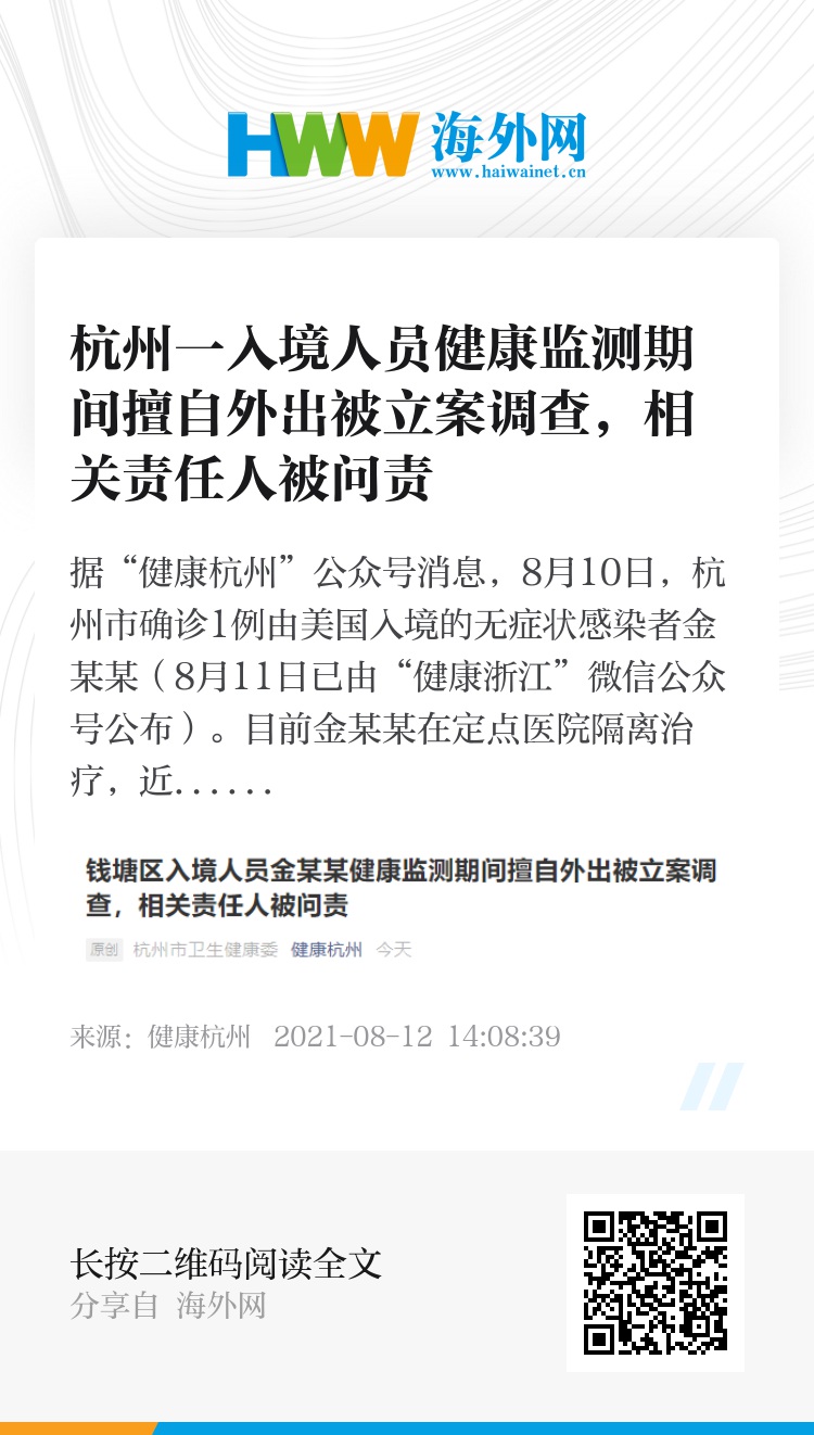 据“健康杭州”公众号消息,8月10日,杭州市确诊1例由美国入境的无症状感染者金某某(8月11日已由“健康浙江”微信公众号公布)。目前金某某在定点医院隔离治疗,近两次核酸检测都为阴性,无症状。