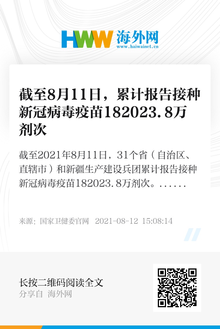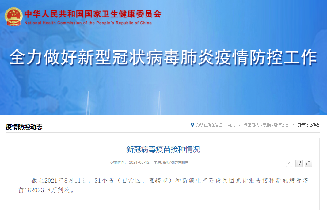 截至2021年8月11日,31个省(自治区、直辖市)和新疆生产建设兵团累计报告接种新冠病毒疫苗182023.8万剂次。