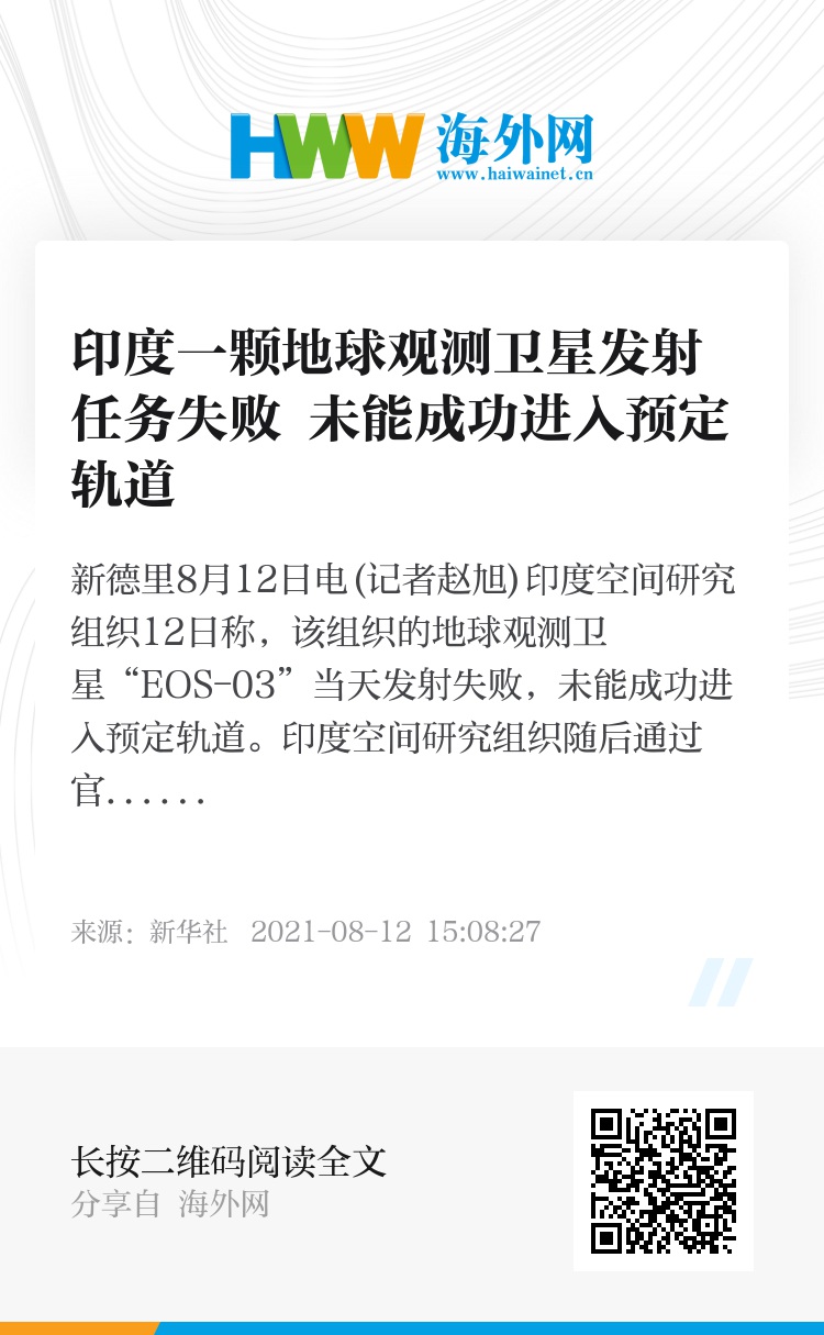 新华社新德里8月12日电(记者赵旭)印度空间研究组织12日称,该组织的地球观测卫星“EOS-03”当天发射失败,未能成功进入预定轨道。