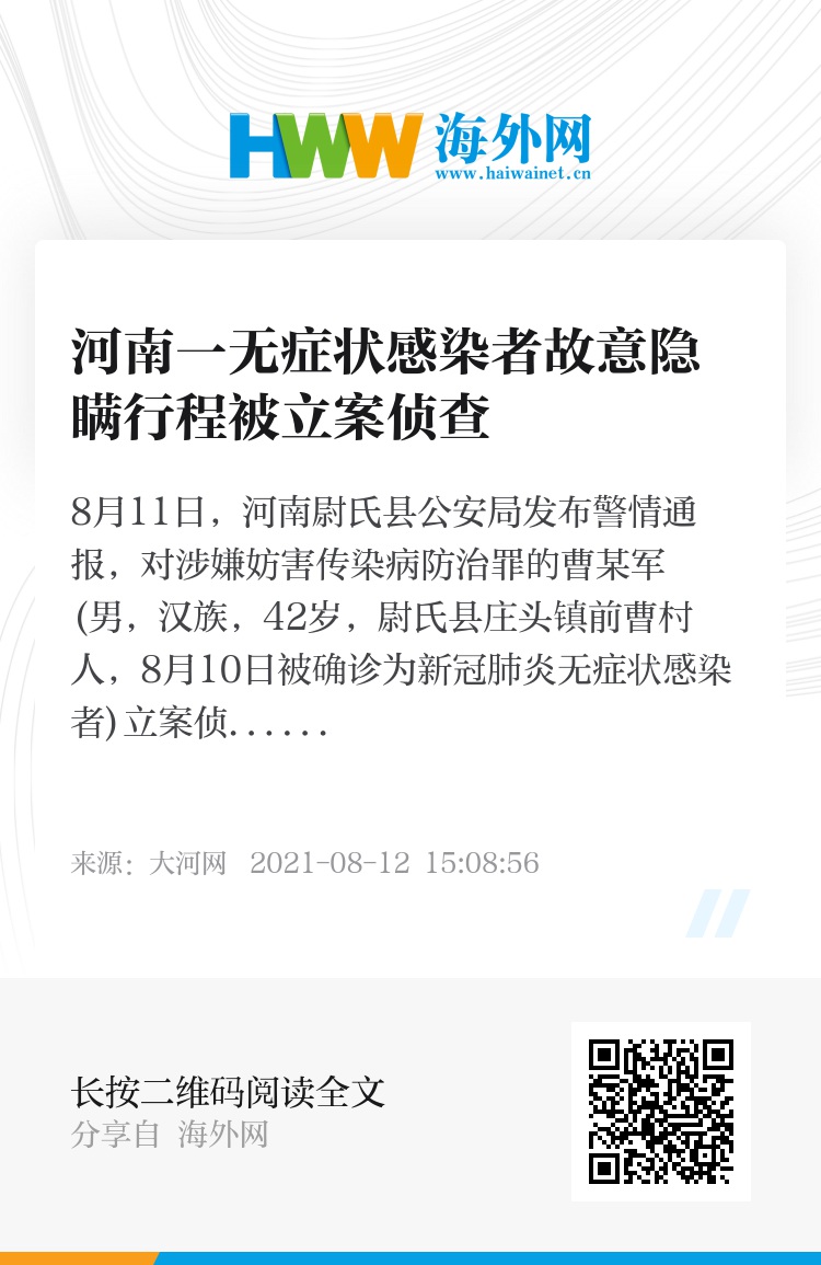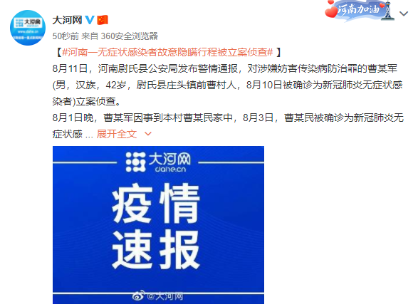 8月11日,河南尉氏县公安局发布警情通报,对涉嫌妨害传染病防治罪的曹某军(男,汉族,42岁,尉氏县庄头镇前曹村人,8月10日被确诊为新冠肺炎无症状感染者)立案侦查。