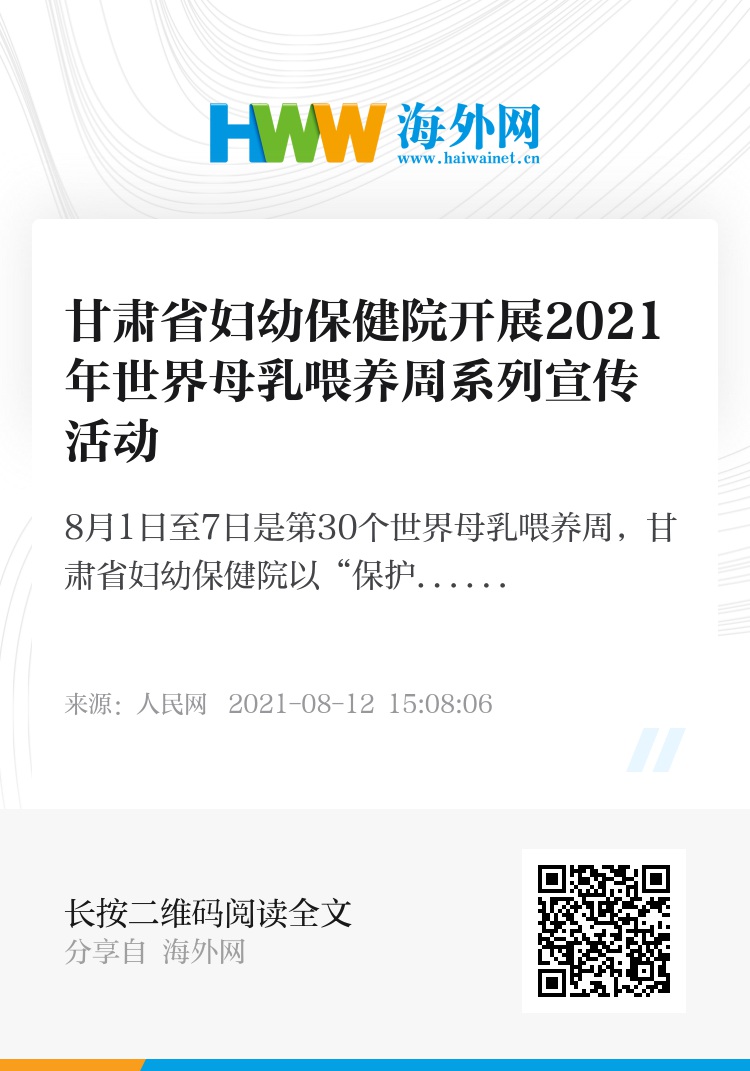 8月1日至7日是第30个世界母乳喂养周,甘肃省妇幼保健院以“保护母乳喂养,共同承担责任”为主题开展了2021年世界母乳喂养周系列宣传活动。