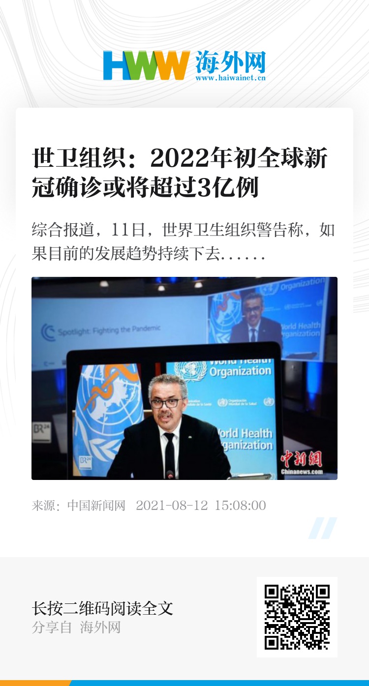 谭德塞指出,全球新冠感染人数是否会达到、以及多久会达到3亿,将取决所有人的作为。以目前疫情发展趋势,预计至2022年初,全球确诊病例总数将超过3亿例,但还有机会去改变。