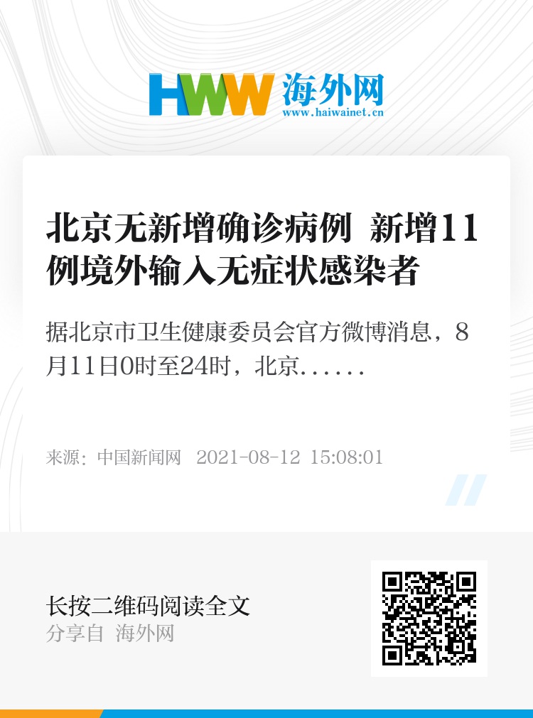据北京市卫生健康委员会官方微博消息,8月11日0时至24时,北京无新增本地确诊病例、疑似病例和无症状感染者;无新增境外输入确诊病例、疑似病例,新增11例境外输入无症状感染者;治愈出院2例。