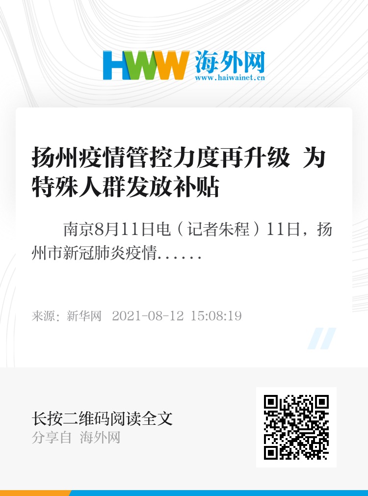 新华社南京8月11日电(记者朱程)11日,扬州市新冠肺炎疫情防控工作指挥部发布通告称,将设置六个重点管控区域严防疫情扩散。区域内封控管理小区居民不得离开所在小区。为保证困难群众生活,扬州还将对主城区5000户困难对象按照300元/户标准发放生活物资。
