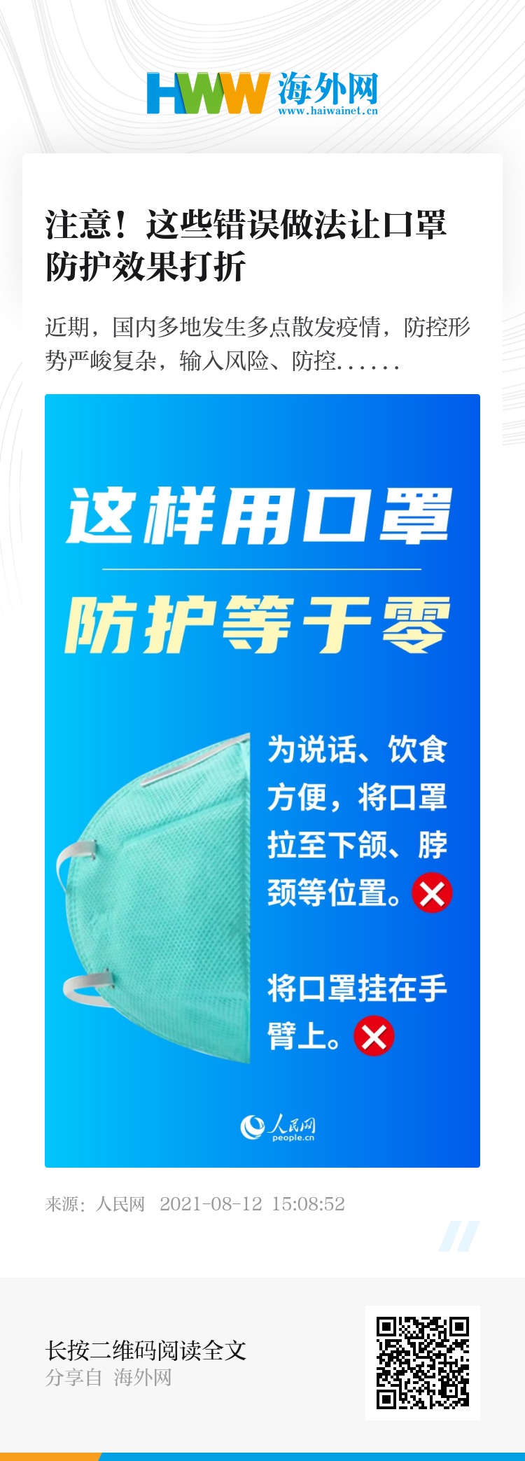 近期,国内多地发生多点散发疫情,防控形势严峻复杂,输入风险、防控压力持续增大。科学、正确佩戴口罩是预防呼吸道传染病的重要措施之一,更是极其重要的个人防疫措施。但是在生活中,一些人为了说话、饮食方便,常将口罩随意拉至下颌、脖颈等位置,有时也将口罩挂在手臂上,殊不知,这样做不仅容易导致口罩内层受到污染,使口罩的防护效果大打折扣,也无形中加大了传播和感染病毒的风险。对此,北京市疾病预防控制中心向公众提出了相关建议。