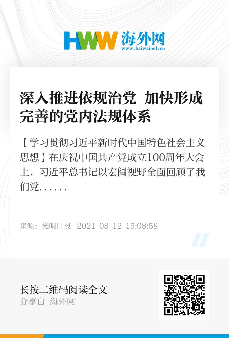 在庆祝中国共产党成立100周年大会上,习近平总书记以宏阔视野全面回顾了我们党在不同历史时期创造的伟大成就,并将“坚持依规治党、形成比较完善的党内法规体系”列为新时代中国特色社会主义的伟大成就之一。在新的征程上,我们要深入推进依规治党,加快形成完善的党内法规体系,将党的建设新的伟大工程不断向前推进。