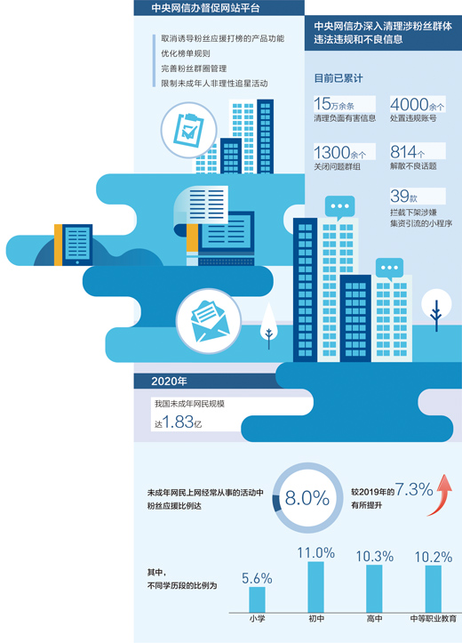 累计清理负面有害信息15万余条,处置违规账号4000余个,关闭问题群组1300余个……这是中央网信办正在开展的“清朗・‘饭圈’乱象整治”专项行动取得的阶段性成效。专项整治旨在规范和引导粉丝群体理性追星。