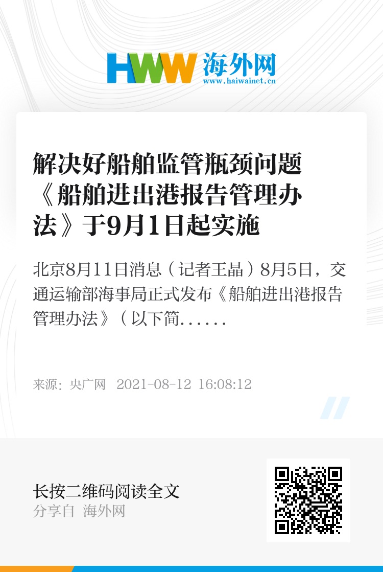 央广网北京8月11日消息(记者王晶)8月5日,交通运输部海事局正式发布《船舶进出港报告管理办法》(以下简称《办法》),自9月1日起施行。
