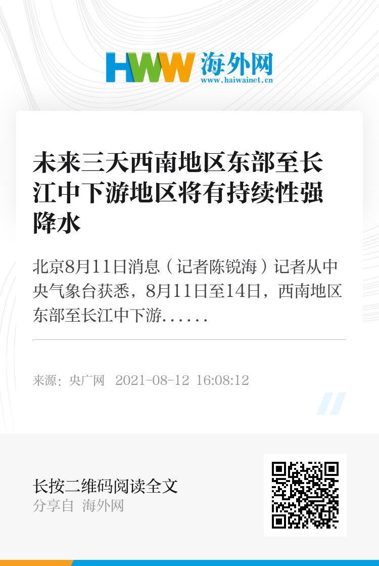 央广网北京8月11日消息(记者陈锐海)记者从中央气象台获悉,8月11日至14日,西南地区东部至长江中下游地区将有持续性强降水,江汉、江淮、江南中北部以及重庆、贵州、云南、华南南部等地的部分地区有大到暴雨,局地有大暴雨(100~180毫米)。长江中下游沿江地区降水最强时段出现在12日至13日,14日降水带南压至江南北部,降水强度略有减弱。中央气象台8月11日6时继续发布暴雨蓝色预警。