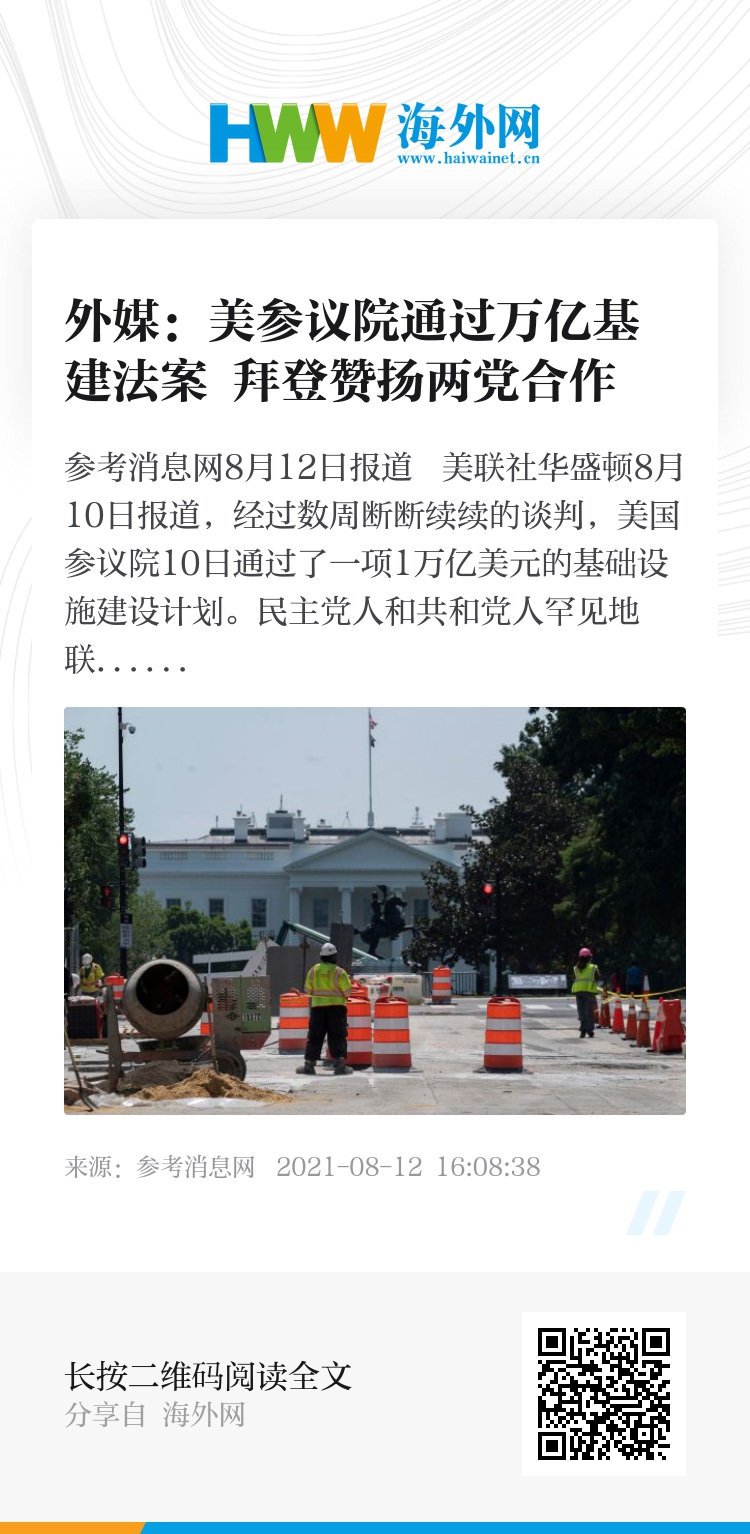 另据路透社华盛顿8月10日报道,美国总统拜登10日赞扬了19名支持一项1万亿美元基建法案的共和党参议员的勇气,并说美国参议院通过该法案为解决其他棘手问题带来了希望。