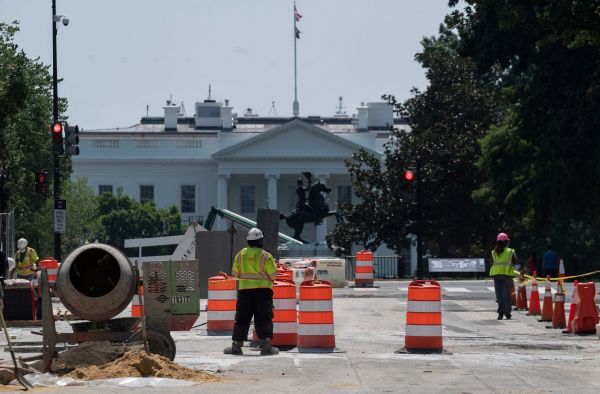 美国参议院10日通过了万亿美元基建计划。图为当日,工作人员在华盛顿白宫附近施工。(法新社)