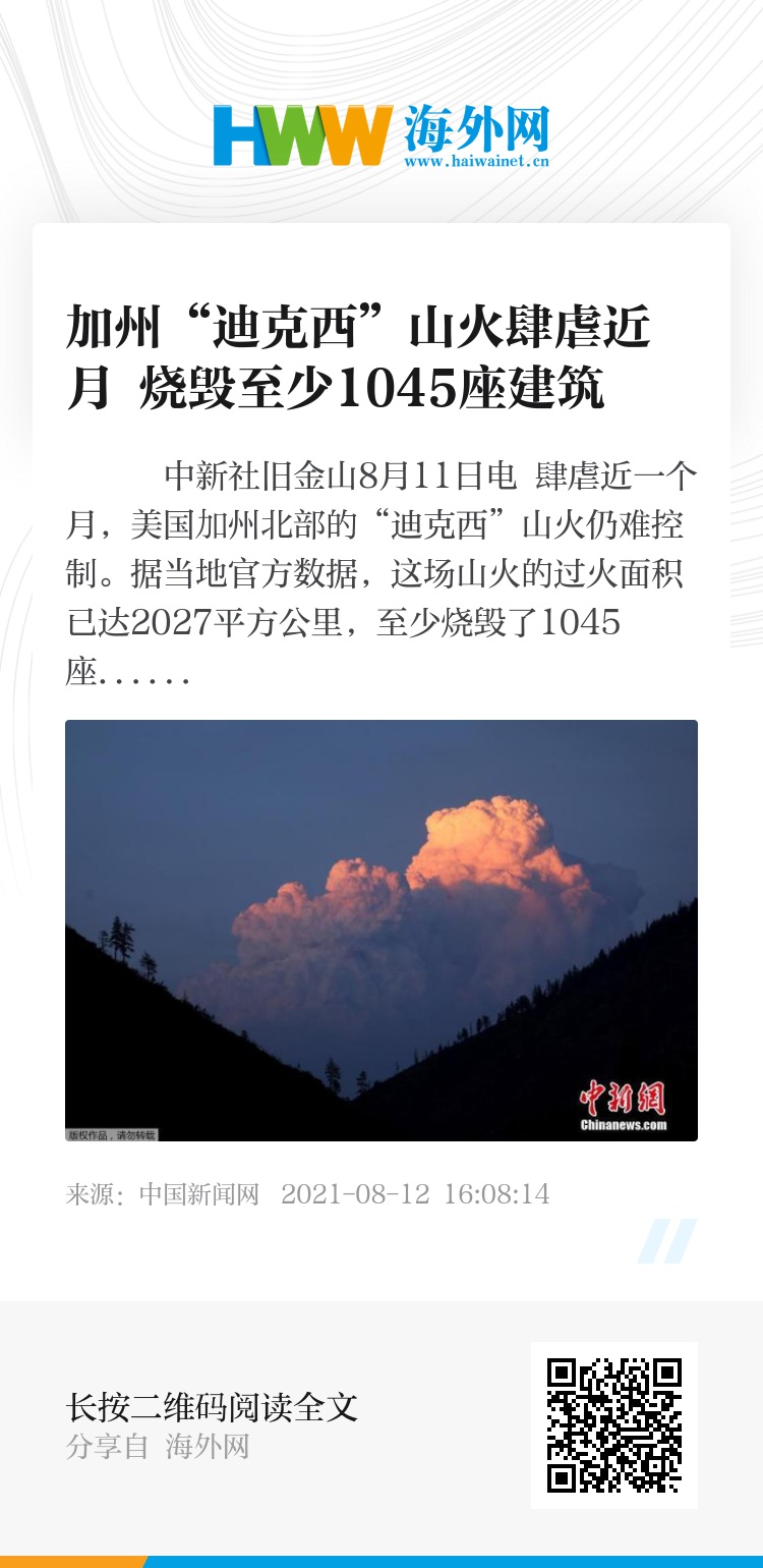 据加州林业和消防局数据,自7月13日燃起的“迪克西”山火已至少摧毁1045座建筑物,其中有550多座为民居。目前仍威胁着超过1.6万座建筑物。