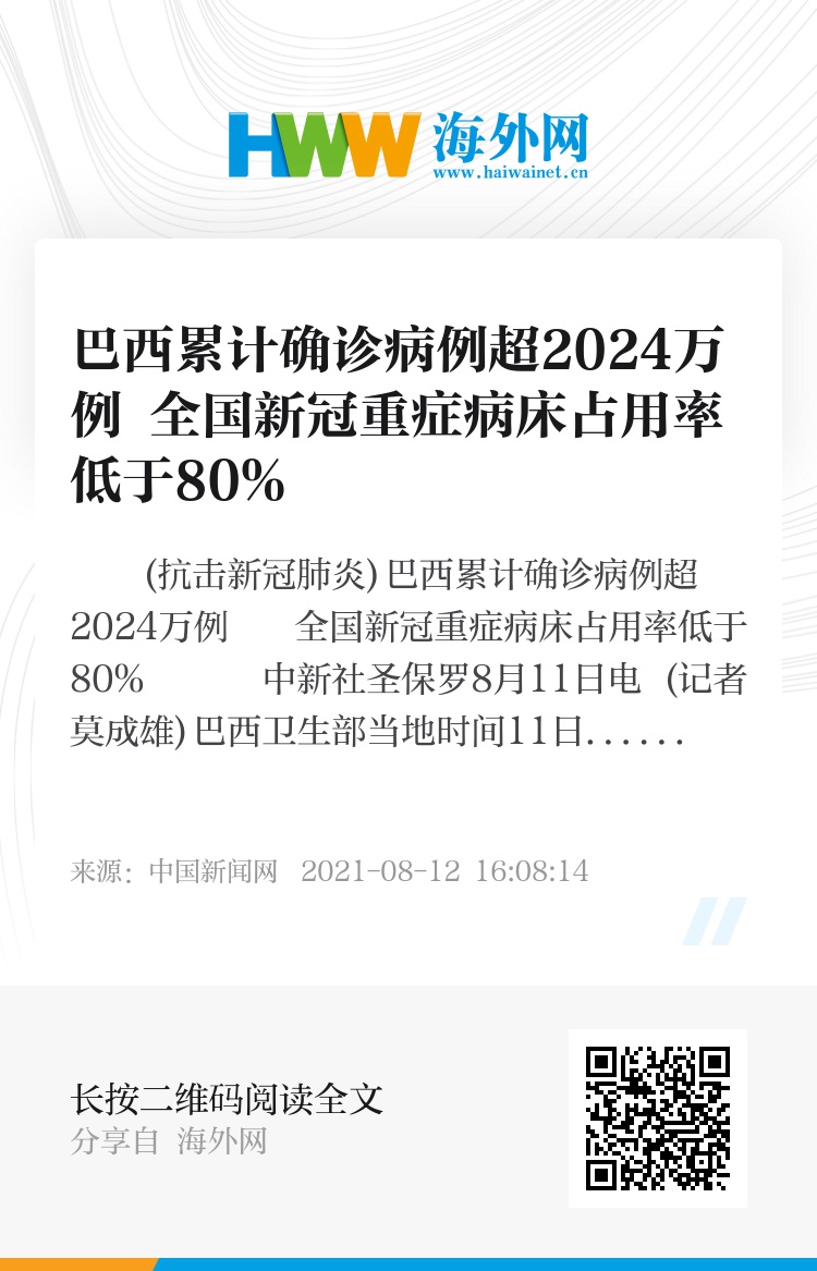 (抗击新冠肺炎)巴西累计确诊病例超2024万例 全国新冠重症病床占用率低于80%