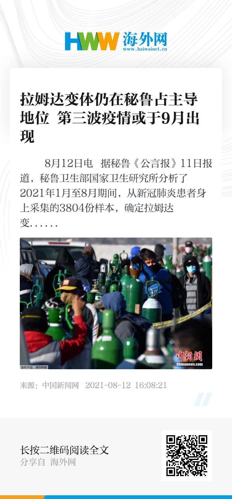 中新网8月12日电 据秘鲁《公言报》11日报道,秘鲁卫生部国家卫生研究所分析了2021年1月至8月期间,从新冠肺炎患者身上采集的3804份样本,确定拉姆达变体仍是秘鲁最主要的变异病毒。