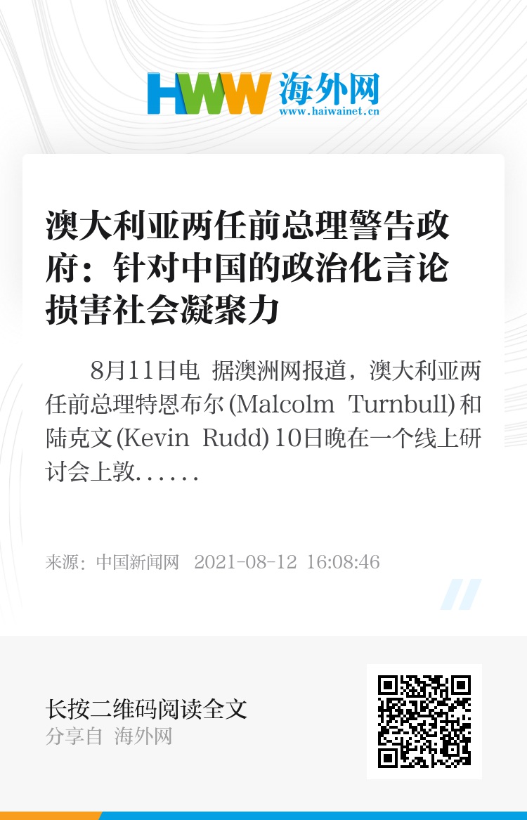 中新网8月11日电 据澳洲网报道,澳大利亚两任前总理特恩布尔(Malcolm Turnbull)和陆克文(Kevin Rudd)10日晚在一个线上研讨会上敦促联邦政府不要出于国内政治目的加大针对中国的言论,称这可能损害澳大利亚的社会凝聚力。