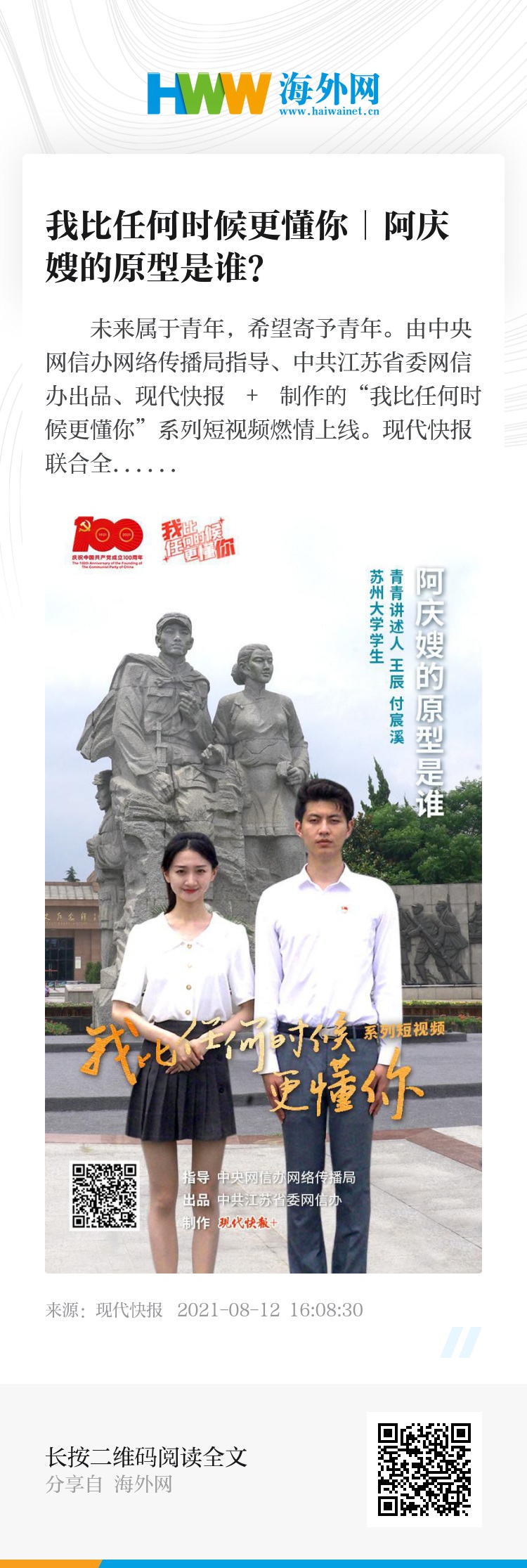 未来属于青年,希望寄予青年。由中央网信办网络传播局指导、中共江苏省委网信办出品、现代快报 + 制作的“我比任何时候更懂你”系列短视频燃情上线。现代快报联合全国 30 所高校、30 个青青讲述人团队,奔赴全国 21 个城市,走进全国 26 家红色场馆,行程 12000 多公里,讲述 30 个党史故事。“我比任何时候更懂你”,这是最青春的追寻和响应,这是青年人对百年大党最深情的告白!