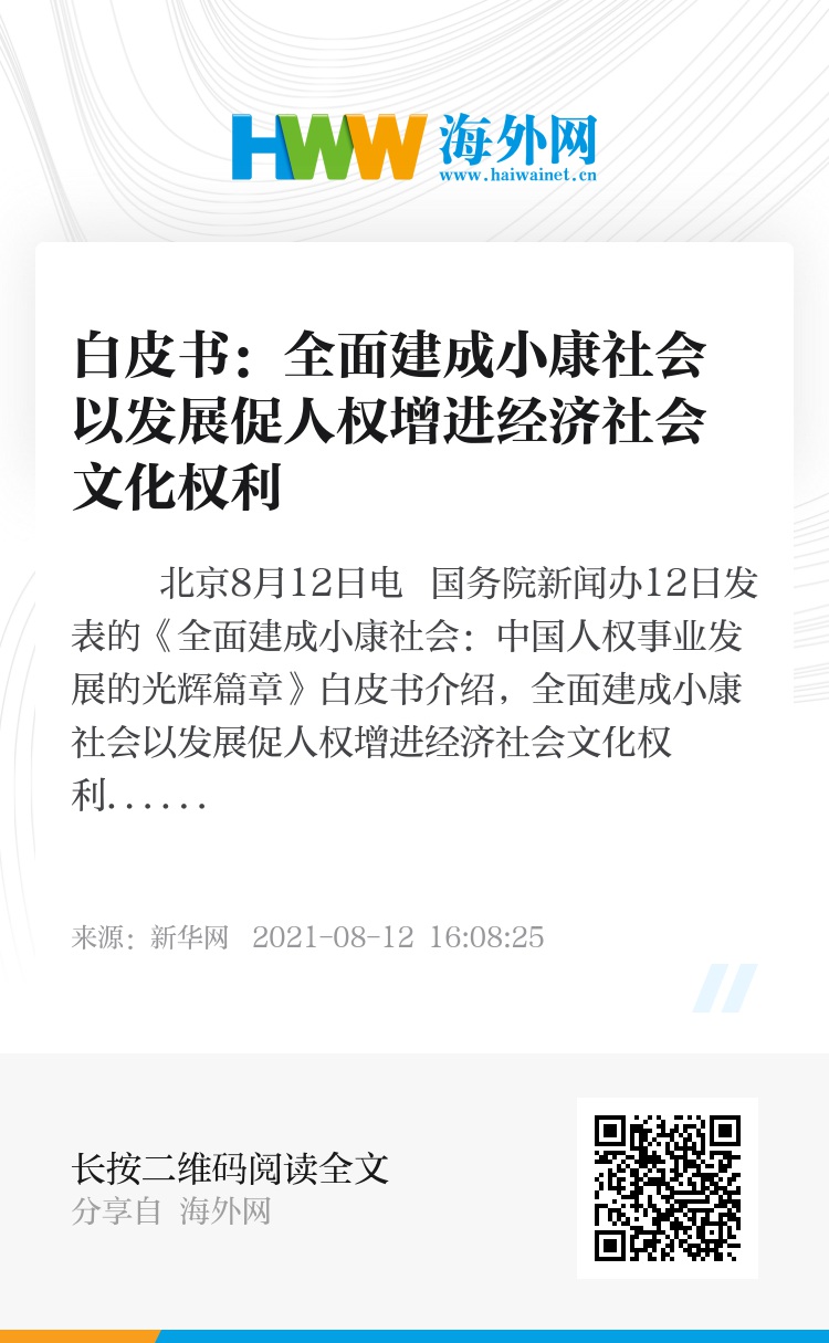 新华社北京8月12日电 国务院新闻办12日发表的《全面建成小康社会:中国人权事业发展的光辉篇章》白皮书介绍,全面建成小康社会以发展促人权增进经济社会文化权利。