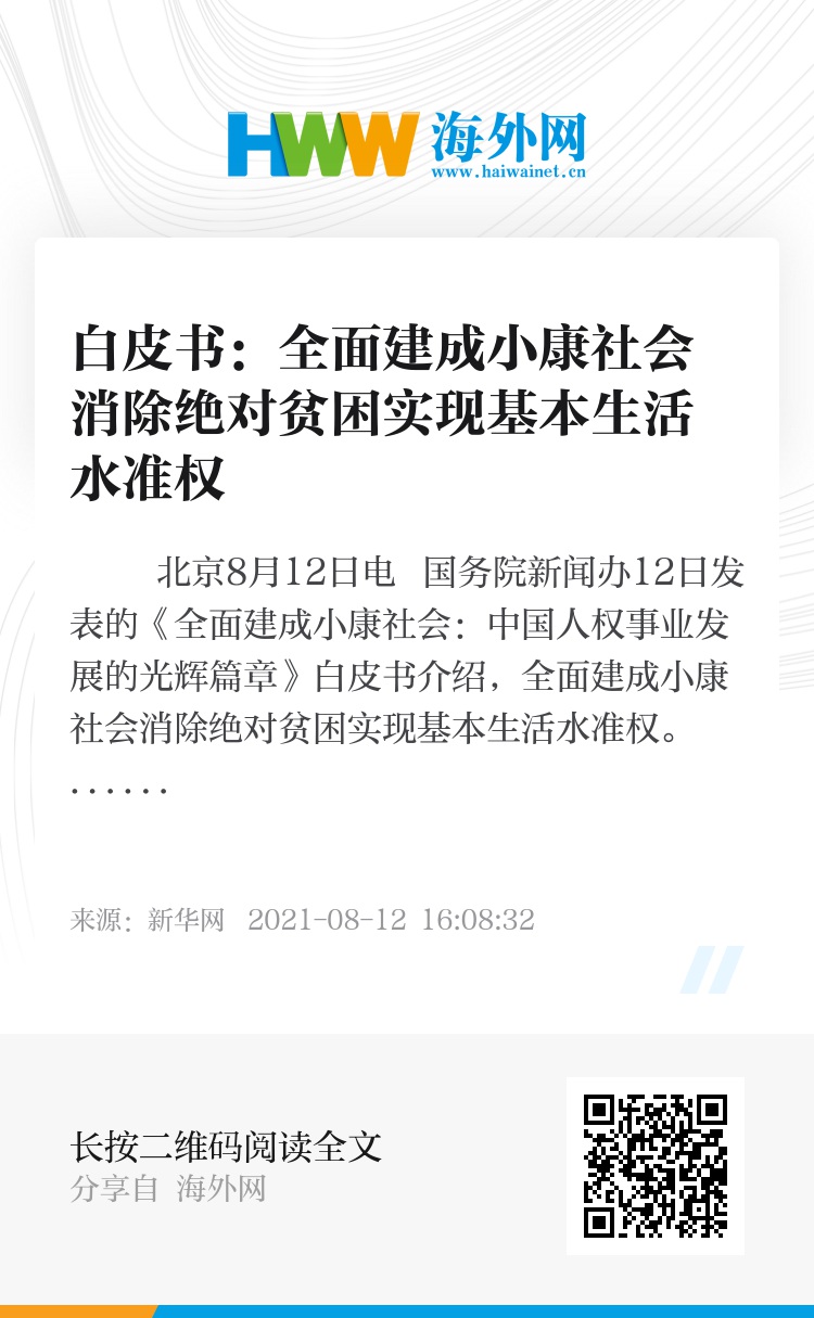 新华社北京8月12日电 国务院新闻办12日发表的《全面建成小康社会:中国人权事业发展的光辉篇章》白皮书介绍,全面建成小康社会消除绝对贫困实现基本生活水准权。