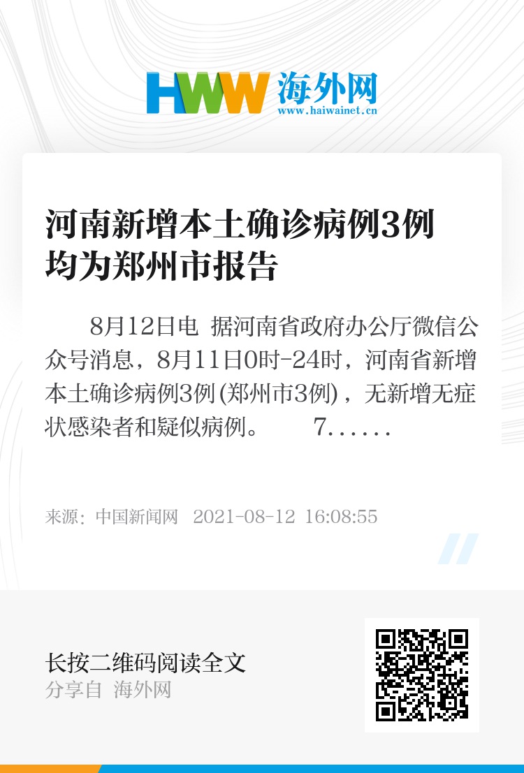 中新网8月12日电 据河南省政府办公厅微信公众号消息,8月11日0时-24时,河南省新增本土确诊病例3例(郑州市3例),无新增无症状感染者和疑似病例。