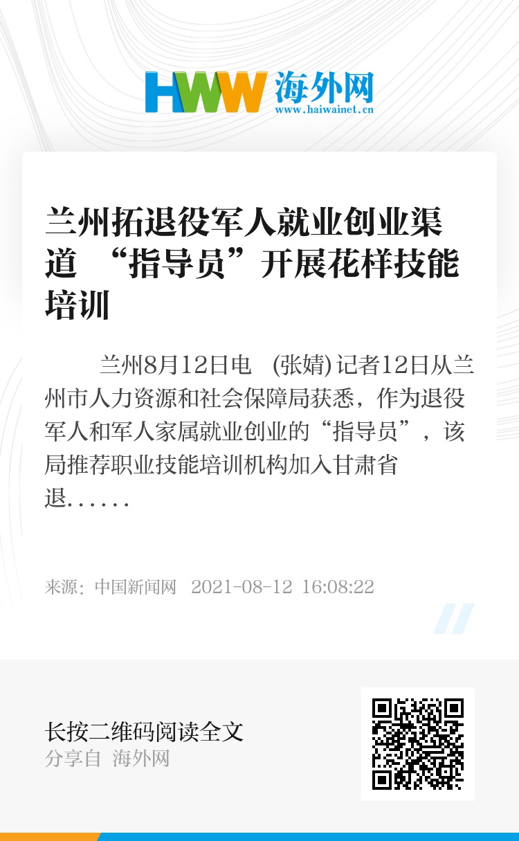 中新网兰州8月12日电 (张婧)记者12日从兰州市人力资源和社会保障局获悉,作为退役军人和军人家属就业创业的“指导员”,该局推荐职业技能培训机构加入甘肃省退役军人培训教育集团,并指导培训机构针对退役军人和军人家属个人意愿,围绕制造业、新兴产业、现代服务业等领域举办花样职业技能培训班,提升就业创业能力,实现高质量就业。