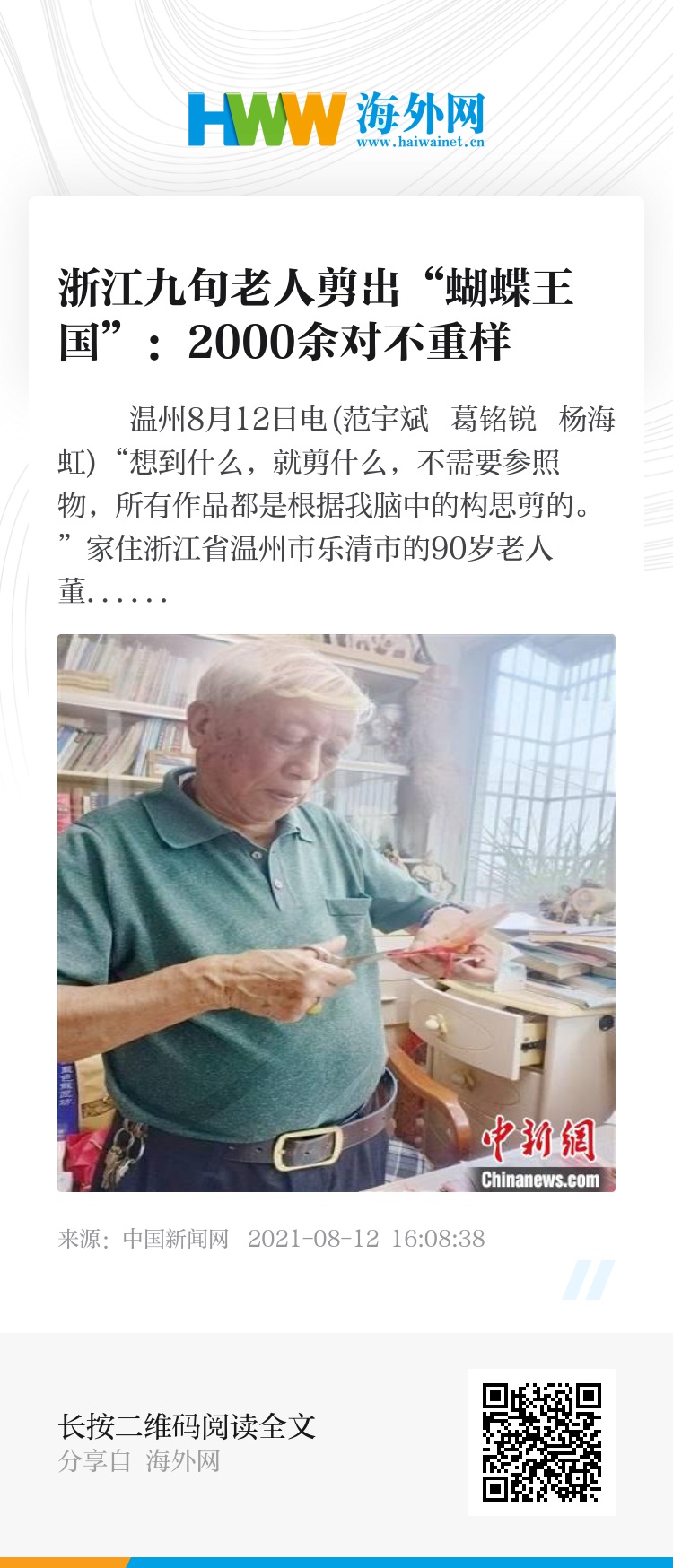 在82岁这年开始学剪纸,8年来,独爱蝴蝶的董国栋变身边的广告纸、包装纸等废品为“宝”,共剪出2000余对不重样的纸蝴蝶作品。如今,不出5分钟,董国栋就能为自家的“蝴蝶王国”添置新成员。