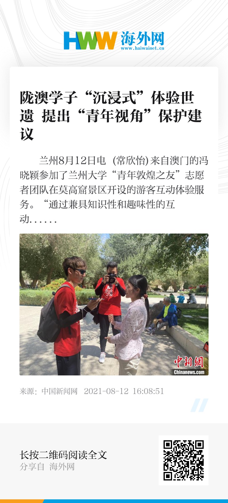 8月12日,为期20多天、由兰州大学举办的“2021海峡两岸暨港澳青年文化行者研学研习计划”正在甘肃进行。作为其中一项,“敦煌澳门双城青少年文化交流与服务学习行动”是文化和旅游部2021年度内地与港澳文化和旅游交流重点项目,该项目以“世界遗产可持续旅游”为主题展开文化体验、案例研修、实践教学、志愿服务等活动,进而探索和总结陇澳青少年文化培育工作的有效模式。