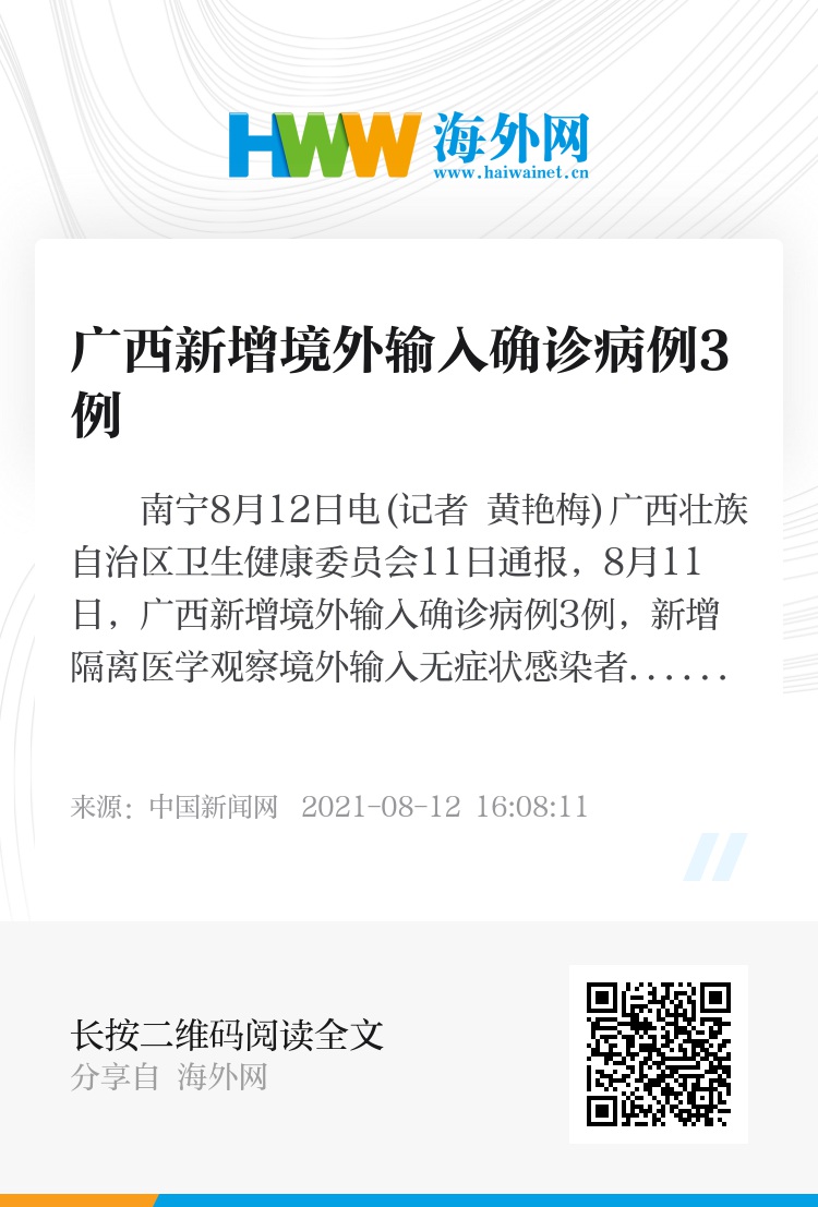 中新网南宁8月12日电(记者 黄艳梅)广西壮族自治区卫生健康委员会11日通报,8月11日,广西新增境外输入确诊病例3例,新增隔离医学观察境外输入无症状感染者1例。