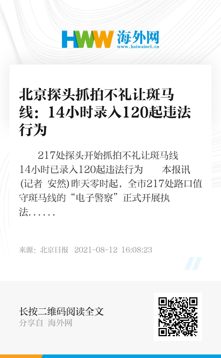 本报讯(记者 安然)昨天零时起,全市217处路口值守斑马线的“电子警察”正式开展执法工作,截至昨天14时,共抓拍录入120起机动车不礼让斑马线违法。记者从交管部门获悉,“行人绿灯下通行”是电子眼拍摄“不礼让斑马线”的前提,驾驶员“不避让闯红灯行人也要被罚”的担心并无必要。