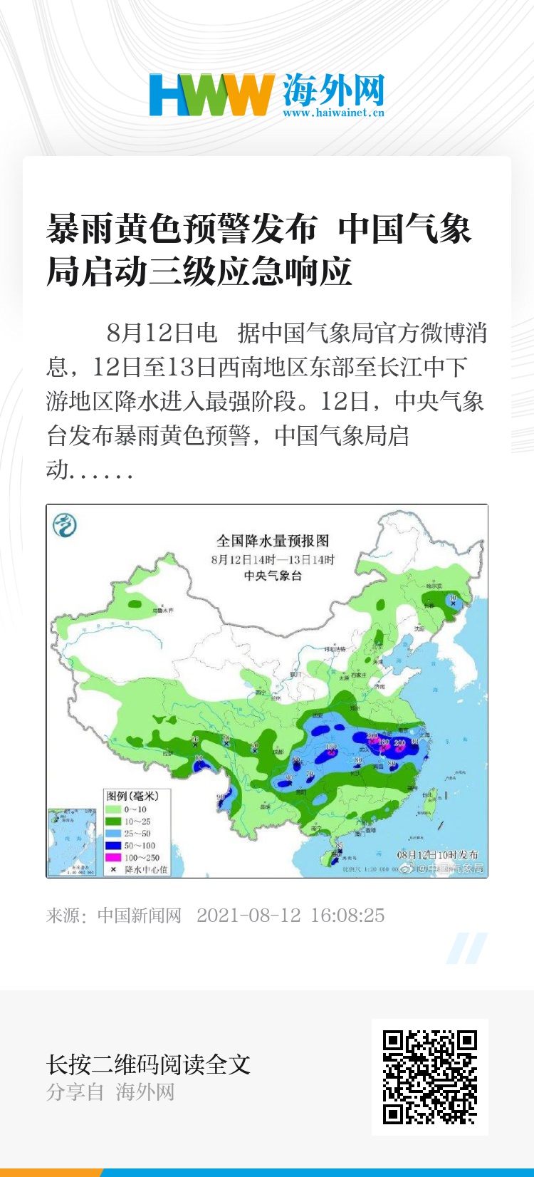 中新网8月12日电 据中国气象局官方微博消息,12日至13日西南地区东部至长江中下游地区降水进入最强阶段。12日,中央气象台发布暴雨黄色预警,中国气象局启动三级应急响应,上海、江苏、浙江、江西、安徽、湖北、重庆及可能受影响的省级气象局根据实际研判启动或调整相应级别应急响应,指导市(县、区)气象局及时发布短临预警。