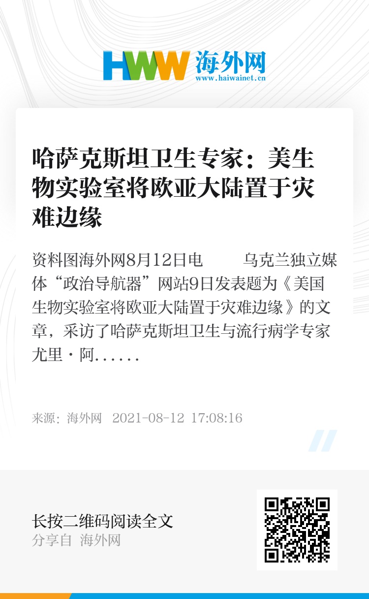 海外网8月12日电 乌克兰独立媒体“政治导航器”网站9日发表题为《美国生物实验室将欧亚大陆置于灾难边缘》的文章,采访了哈萨克斯坦卫生与流行病学专家尤里·阿诺辛,他表达了对美国在欧亚大陆建立生物实验室的担忧。