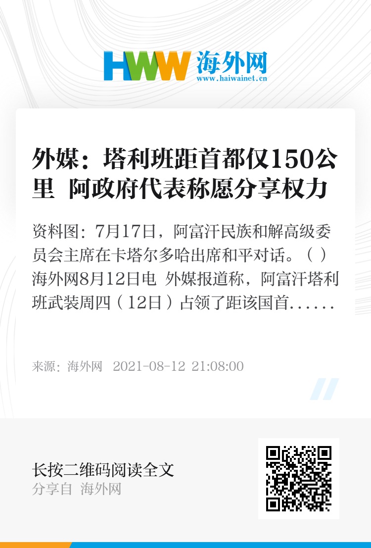 海外网8月12日电 外媒报道称,阿富汗塔利班武装周四(12日)占领了距该国首都喀布尔仅150公里的战略城市加兹尼,使得该组织在一周内占领的省会城市达到10个。同日,阿富汗政府代表在卡塔尔多哈举行的谈判中提出愿意分享权力,换取塔利班方面的停火。