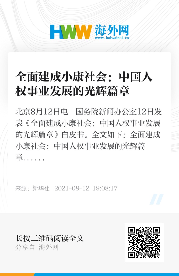 新华社北京8月12日电 国务院新闻办公室12日发表《全面建成小康社会:中国人权事业发展的光辉篇章》白皮书。全文如下:
