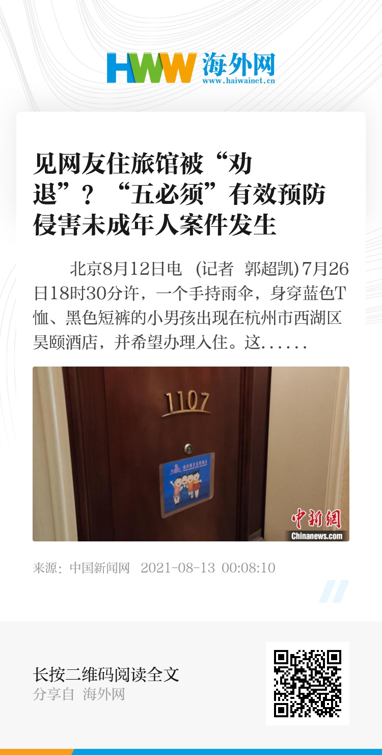 此外,“五必须”的出台对防范未成年人网友见面发生不测也大有帮助。孙晓龙介绍道,今年6月一名19岁的成年男子到杭州萧山某酒店登记入住,酒店保安在巡查中发现有一名12岁的未成年女孩未经访客登记就进入了该男子房间,工作人员按照公安部“五必须”对未成年女孩和男子进行询问,双方自称是网友关系,酒店立即将该情况报告至辖区公安机关,后经公安机关在现场教育,最终联系上其监护人,由该女孩监护人到酒店将其接回。
