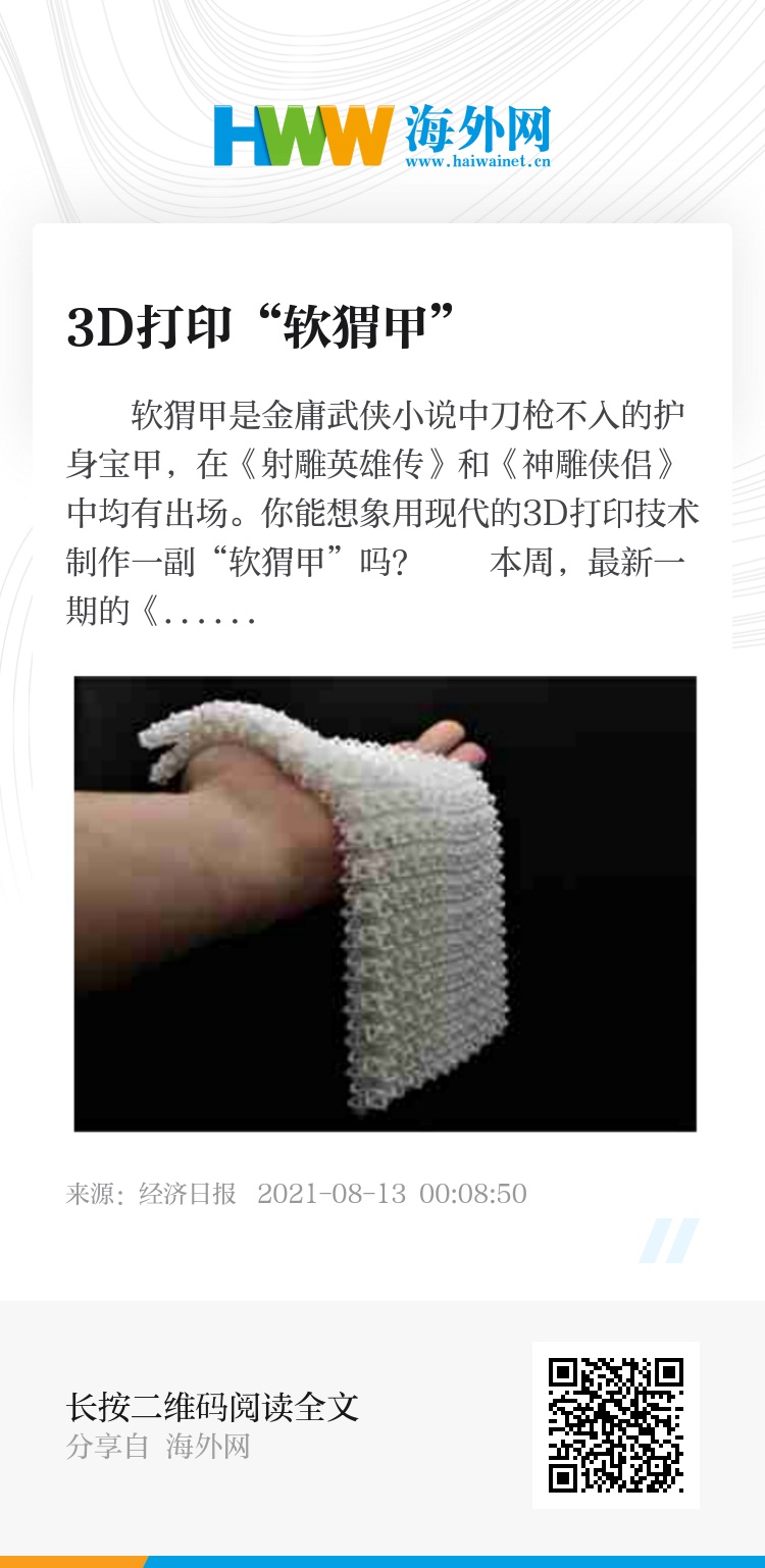软猬甲是金庸武侠小说中刀枪不入的护身宝甲,在《射雕英雄传》和《神雕侠侣》中均有出场。你能想象用现代的3D打印技术制作一副“软猬甲”吗?