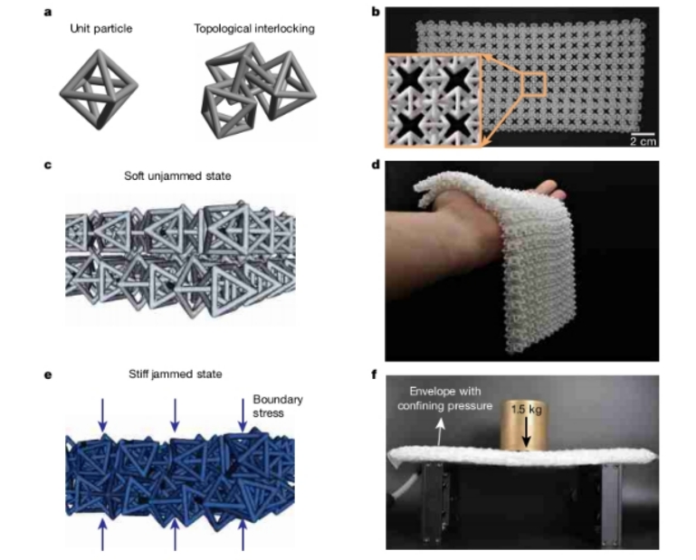 美国加州理工学院的Chiara Daraio和同事设计了一种由3D打印的聚合物元素(而非织物)联锁而成的面料,这种面料能在柔软和坚硬的形状间逐渐切换。处于天然状态时,这种面料易弯折,能披挂在复杂物体表面。处于压缩状态时,面料的联锁颗粒会挤在一起,坚硬度是松散状态下的25倍左右。最后得到的结构,其最大载重量为自身重量的30倍以上。作者认为,这种特性预示了穿戴式可重构结构的光明前景,可重构面料可能需要贴合人体,或是能在形成复杂结构后固定住。