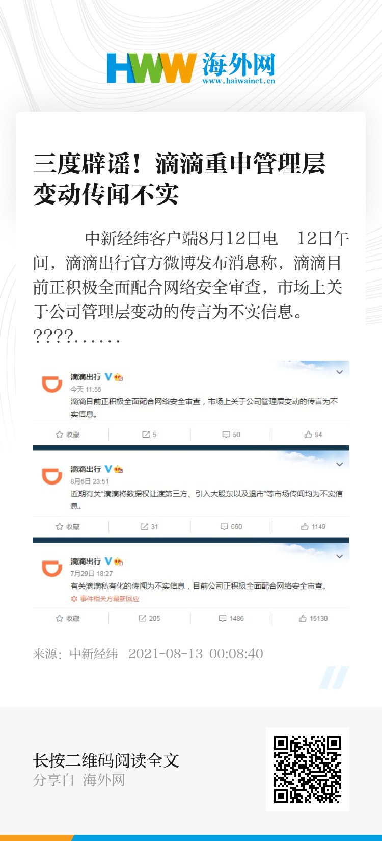 中新经纬客户端8月12日电 12日午间,滴滴出行官方微博发布消息称,滴滴目前正积极全面配合网络安全审查,市场上关于公司管理层变动的传言为不实信息。 ????