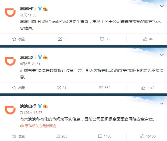 此前的8月6日,滴滴出行发文称:近期有关“滴滴将数据权让渡第三方、引入大股东以及退市”等市场传闻均为不实信息。
