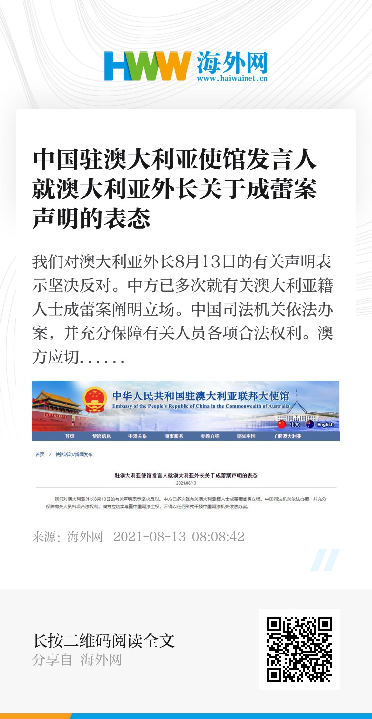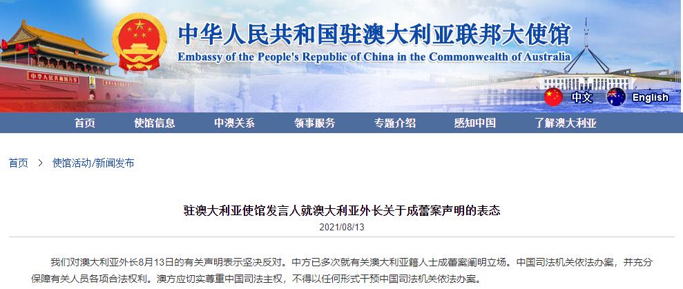 我们对澳大利亚外长8月13日的有关声明表示坚决反对。中方已多次就有关澳大利亚籍人士成蕾案阐明立场。中国司法机关依法办案,并充分保障有关人员各项合法权利。澳方应切实尊重中国司法主权,不得以任何形式干预中国司法机关依法办案。