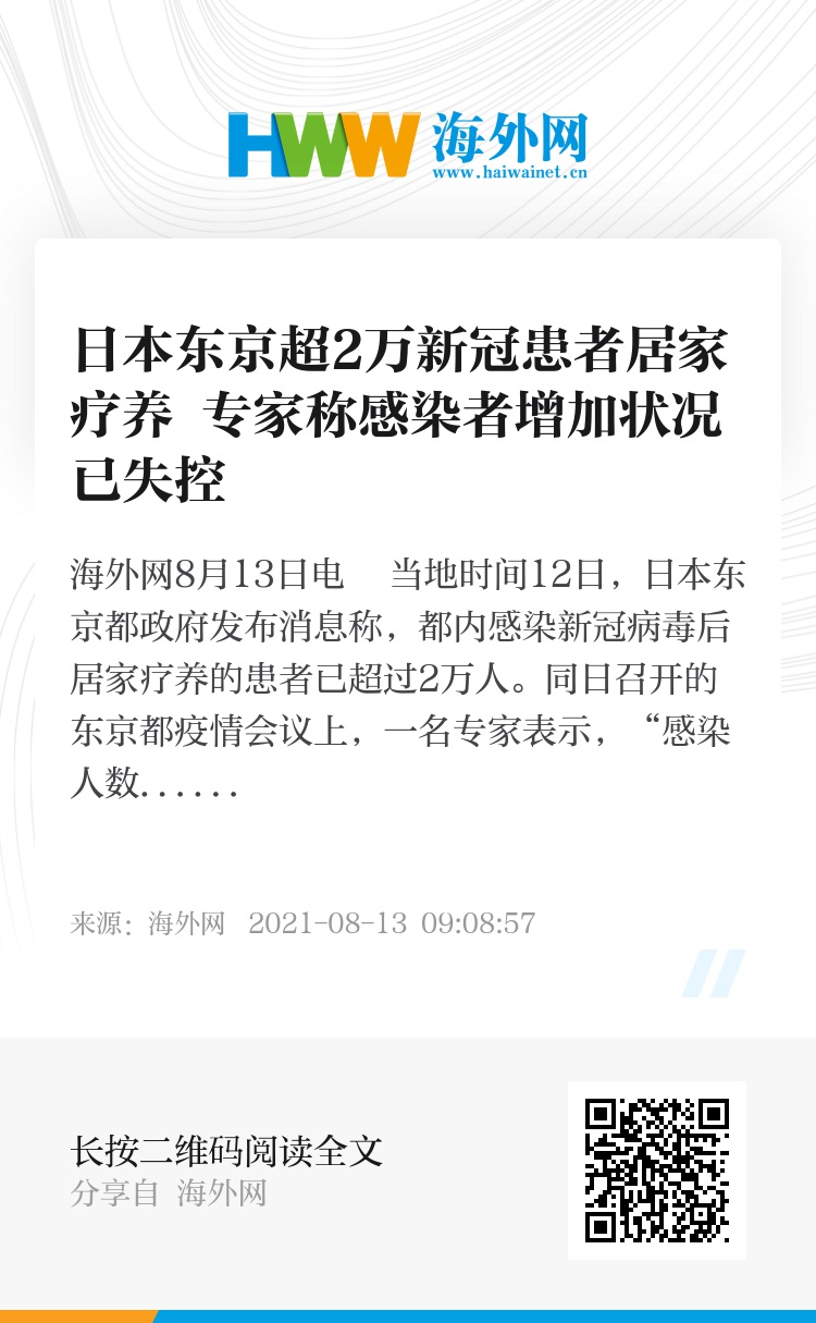 海外网8月13日电 当地时间12日,日本东京都政府发布消息称,都内感染新冠病毒后居家疗养的患者已超过2万人。同日召开的东京都疫情会议上,一名专家表示,“感染人数的增加状况已经失去控制”。