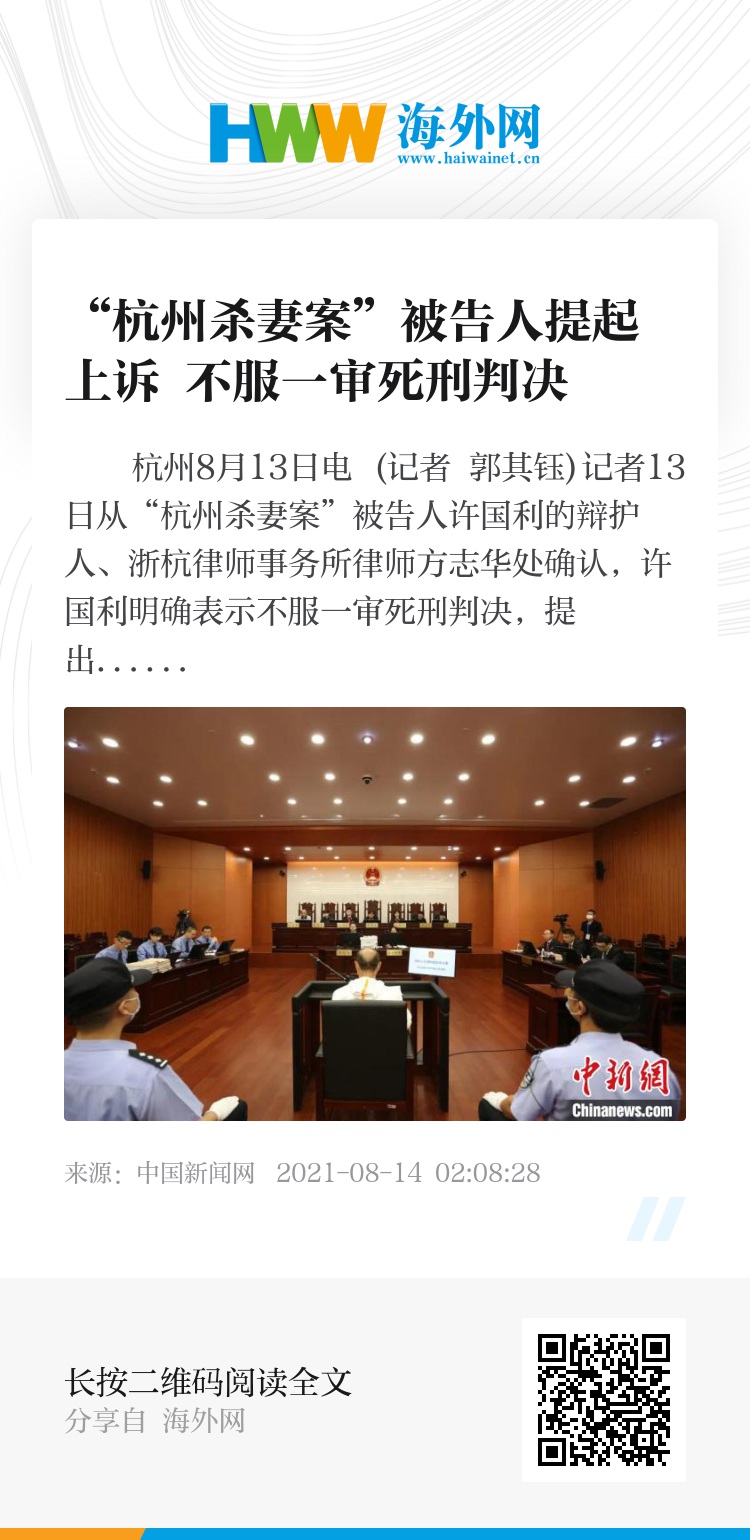 中新网杭州8月13日电 (记者 郭其钰)记者13日从“杭州杀妻案”被告人许国利的辩护人、浙杭律师事务所律师方志华处确认,许国利明确表示不服一审死刑判决,提出上诉。上诉材料已于8月4日提交杭州市中级人民法院,后由杭州中院将相关材料送至浙江省高级人民法院,启动立案等程序。
