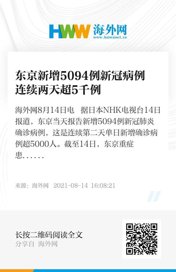 海外网8月14日电 据日本NHK电视台14日报道,东京当天报告新增5094例新冠肺炎确诊病例,这是连续第二天单日新增确诊病例超5000人。截至14日,东京重症患者增加18人,达到245例。目前,新冠病毒正在东京地区快速蔓延。(海外网 汪晓宇)