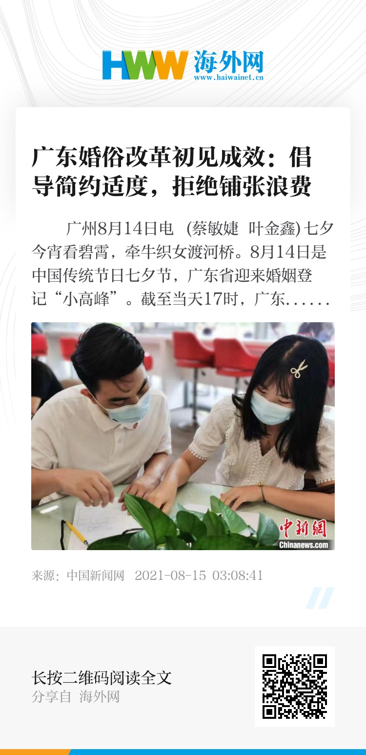 今年4月,民政部将广州市确认为全国婚俗改革实验区之一。同年5月,广东省民政厅确定东莞市、珠海市香洲区、汕头市澄海区、云浮市云城区为全省婚俗改革实验区。上述地区民政部门围绕婚俗改革试点主题,传承发扬中华优秀婚姻家庭文化,推进婚姻领域移风易俗。目前,在各试点地区已初见成效。