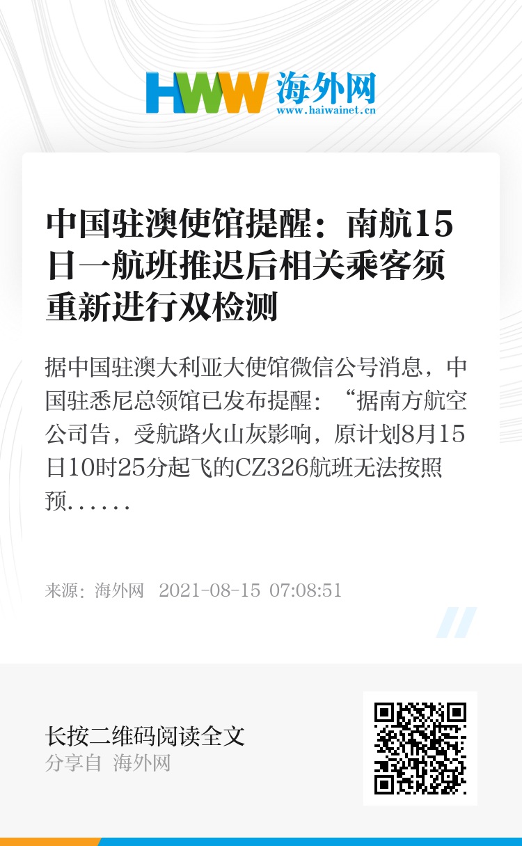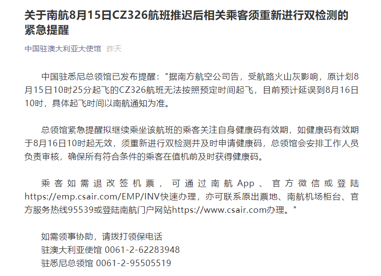 据中国驻澳大利亚大使馆微信公号消息,中国驻悉尼总领馆已发布提醒:“据南方航空公司告,受航路火山灰影响,原计划8月15日10时25分起飞的CZ326航班无法按照预定时间起飞,目前预计延误到8月16日10时,具体起飞时间以南航通知为准。